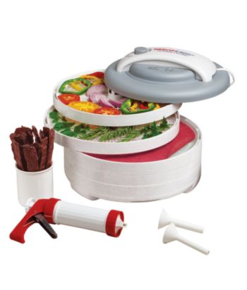 Shop for Food Dehydrator from SmallApplianceSource.com! The Nesco American Harvest Snackmaster Express All-In-One Kit takes the popular Express Dehydrator and combines it with a variety of accessories. The resulting kit lets you make quick nutritious snacks at home with a minimum of fuss. This set-up is a fantastic gift for any foodie in your life - or treat yourself and your family to one. This dehydrator features 500 watts of power and a top-mounted fan which prevents liquids from dripping into the heating chamber. The exterior is opaque and designed to block exterior UV light which can sap nutrients from your food. It features an adjustable thermostat from 95 to 155 degrees F and operates via a patented Converga-Flow drying system. Converga-Flow forces air around the food trays and through a pressurized exterior container resulting in faster more even more nutritious results. No tray rotation is necessary! This dehydrator comes complete with five drying trays as well as two fruit roll sheets a jerky gun with three tip attachments two drying screens a set of five jerky spices/ cures and a recipe book. Expand your dehydrator with the optional Add-A-Tray accessories; this unit can hold up to 12 trays. About NescoThe Nesco Roaster first appeared on the scene in the early 1930s in Milwaukee Wisconsin. Nesco (the National Enamel and Stamping Company) was a well-known maker of pots and pans and other kitchen items but the roaster was one of their first forays into electric appliances. History was made. The roaster quickly spread throughout Wisconsin farms and became an extremely popular accessory in rural kitchens. Now produced by the Metal Ware Corporation of Two Rivers Wisconsin the Nesco Roaster has entered our homes as one of the most versatile dependable and useful appliances we own. Nesco continues to produce their famous roaster complete with new technological advances like convection air fans and non-stick coatings. There's nothing like an American classic.